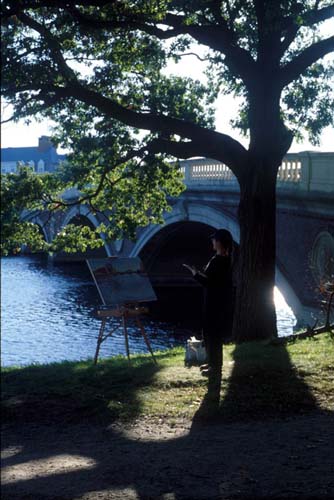 The riverbank near Harvard is a vibrant public space. People come to jog, bicycle, fly kites, paint, sleep, picnic, and read. The river seems to bring out different, more relaxed side of people. Along the Charles, people seem to stop keeping track of time and lose themselves in their surroundings. |
