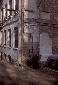 one of these elements standing alone would not be that unique, but put several of them together in this densely packed neighborhood and the composition becomes alive