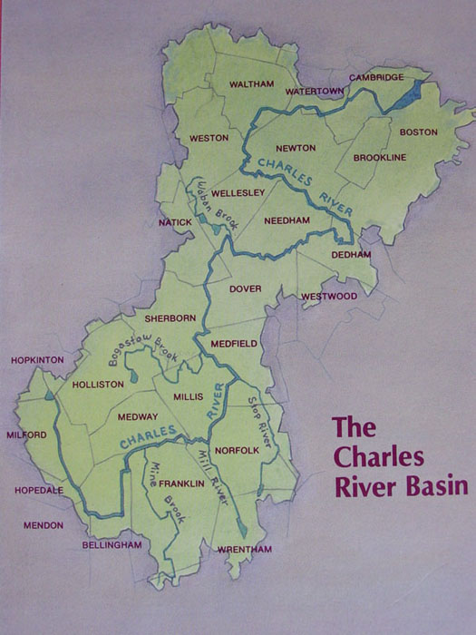 ..the Charles runs eighty river miles from Hopkinton to Boston Harbor...draining 400 square miles...with more than 20,000 wetland acres and seventy tributary streams...