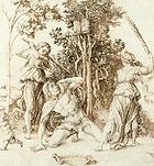 Ovid also recounts that the Ciconian[35] women, Dionysus' followers, spurned by Orpheus who'd forsworn the love of women after the death of Eurydice and had taken only youths as his lovers,[36] first threw sticks and stones at him as he played, but his music was so beautiful even the rocks and branches refused to hit him. Enraged, the women tore him to pieces during the frenzy of their Bacchic orgies.[37] Medieval folkore put additional spin on the story: in Albrecht Dürer's drawing (illustration, right) the ribbon high in the tree is lettered Orfeus der erst puseran ("Orpheus, the first sodomite")—an interpretation of the passage in Ovid (Bk. X) where Orpheus is said to have been "the first of the Thracian people to transfer his love to young boys." His head and lyre, still singing mournful songs, floated down the swift Hebrus to the Mediterranean shore. There, the winds and waves carried them on to the Lesbos[38] shore, where the inhabitants buried his head and a shrine was built in his honour near Antissa; there his oracle prophesied, until it was silenced by Apollo (Life of Apollonius of Tyana, book v.4.14). The lyre was carried to heaven by the Muses, and was placed among the stars. The Muses also gathered up the fragments of his body and buried them at Leibethra[39] below Mount Olympus, where the nightingales sang over his grave. After the river Sys flooded[40] Leibethra Macedonians took his bones to Dion. His soul returned to the underworld, where he was re-united at last with his beloved Eurydice. Another legend places his tomb at Dion,[32] near Pydna in Macedon. Other accounts of his death are that he killed himself from grief at the failure of his journey to Hades, or that he was struck with lightning by Zeus for having revealed the mysteries of the gods to men.[41]