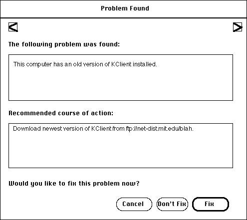 After the Application is told to fix problems found by the tests, it brings up a movable modal dialog box for each error detected, one at a time, and recommends to the user what actions should be taken to resolve problems found during the tests, and asks the user whether to fix the error right then. Note that neither the "fix" nor the "don't fix" buttons are highlighted if the application can't fix a problem itself. The user can use the "back" and "next" buttons to move between problems without making decision about fixing a problem. The text in both fields should be copyable.