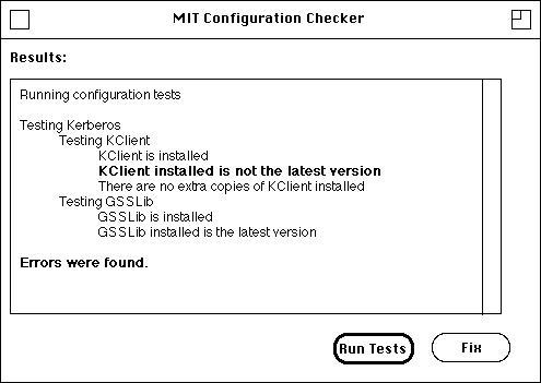 The Application will display the Main Window at startup. This window contains a text field that keeps the user informed of what tests are being performed and what their results are. The "Run Tests" button starts the tests and changes to a "Stop Test" button, which is used to cancel tests in progress. The "Fix" button is used to fix problems found by the tests and is greyed out if there are no problems to fix or no tests have been run. The text is the text field should be copy-able.