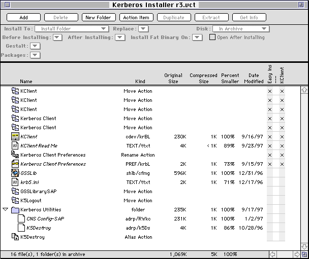 Installs just the KClient software (removing out-of-date versions).NOTE: In theory there should be a "Kerberos 5" package which installs the Kerberos 5 files (GSSLib, CNSConfig, etc.). However, the Kerberos 5 package has been deleted from the template, although placeholder files are still in it. You should not offer the Kerberos 5 files for installation unless your application absolutely requires them. This is because we will be changing the Kerberos 5 files in the near future.