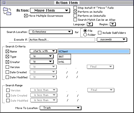 (9a) Make another Move action item that checks the "Control Panels" folder for any out of date Control Panel versions of KClient. It checks by looking for file(s) whose name starts with "KClient", has a file type/creator of cdev/krBL, has a version less than 1.7.6.