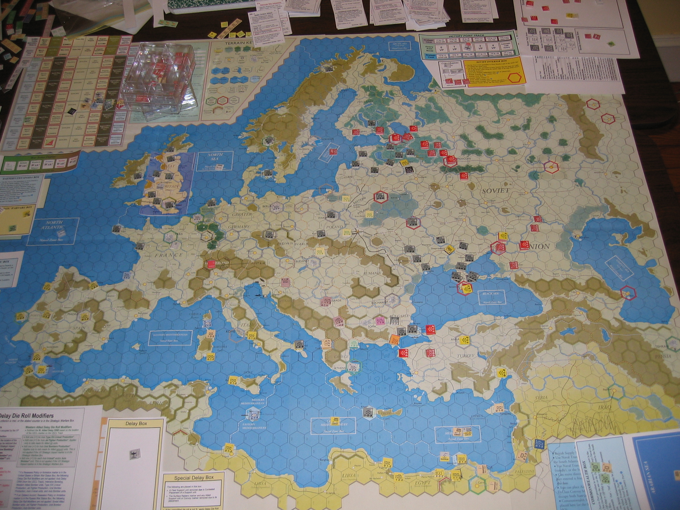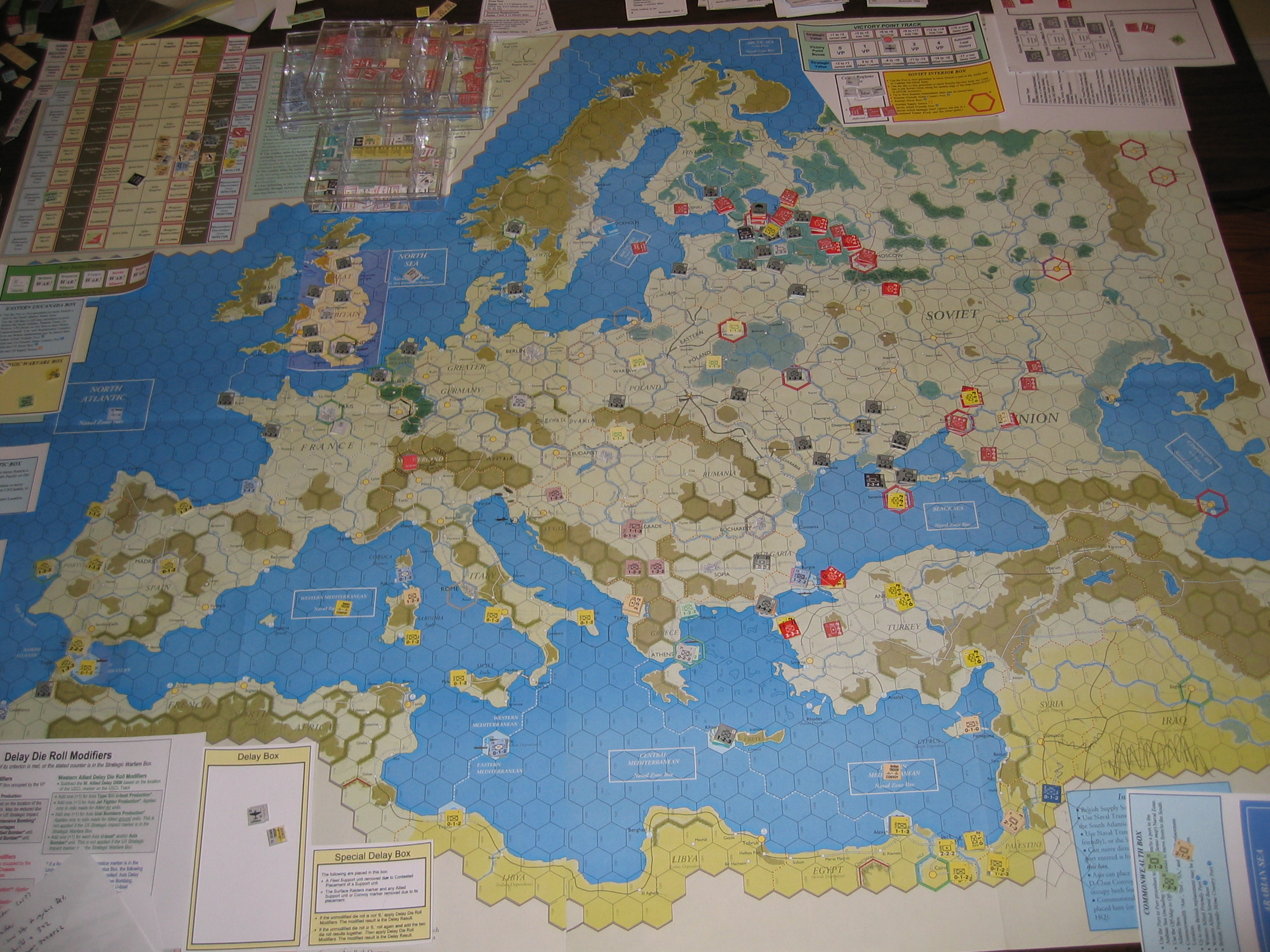Mar/April: Speer/Crusader/Reforms are revealed. The axis begins a campaign of putting the brits in Albania out of supply, massive support unit commitment by both the Axis and the brits. The last turks in the balkans are cleared out of salonika. The last british support unit (Royal Navy), apparently saved for this purpose, is used to invade salonika, depositing two steps there within HQ range of the five brits in Albania. The Uboats and Regia Marina, which were contested in the grand naval melee in the Central Med, both suffer naval disasters. I put two support units into the Special Delay box, they both get hit. Sigh. However, the two steps that were deposited in Salonika had been the HQ sitting in Suez, up until now....