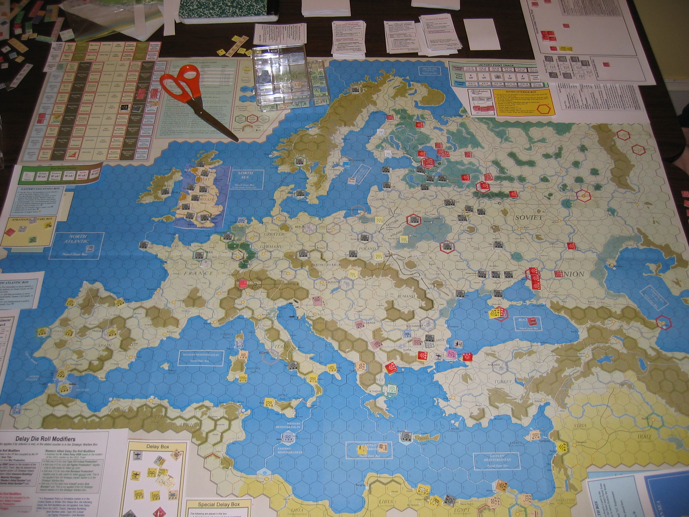 Third turn of barbarossa, I blew up 7 soviet steps in a Line fort outside Leningrad. The brits invaded Albania and started setting up a Balkan presence. At this point, there were ~8 turkish and ~10 soviet steps in the balkans, along with most of the Yugoslavian and Greek armies and ~7 german steps. I took the Push marker from the Political Option. I think it was around here that the WAllies picked up a Political commitment, and popped their interceptor (well, and rolling on the Table Of Allied Minors).