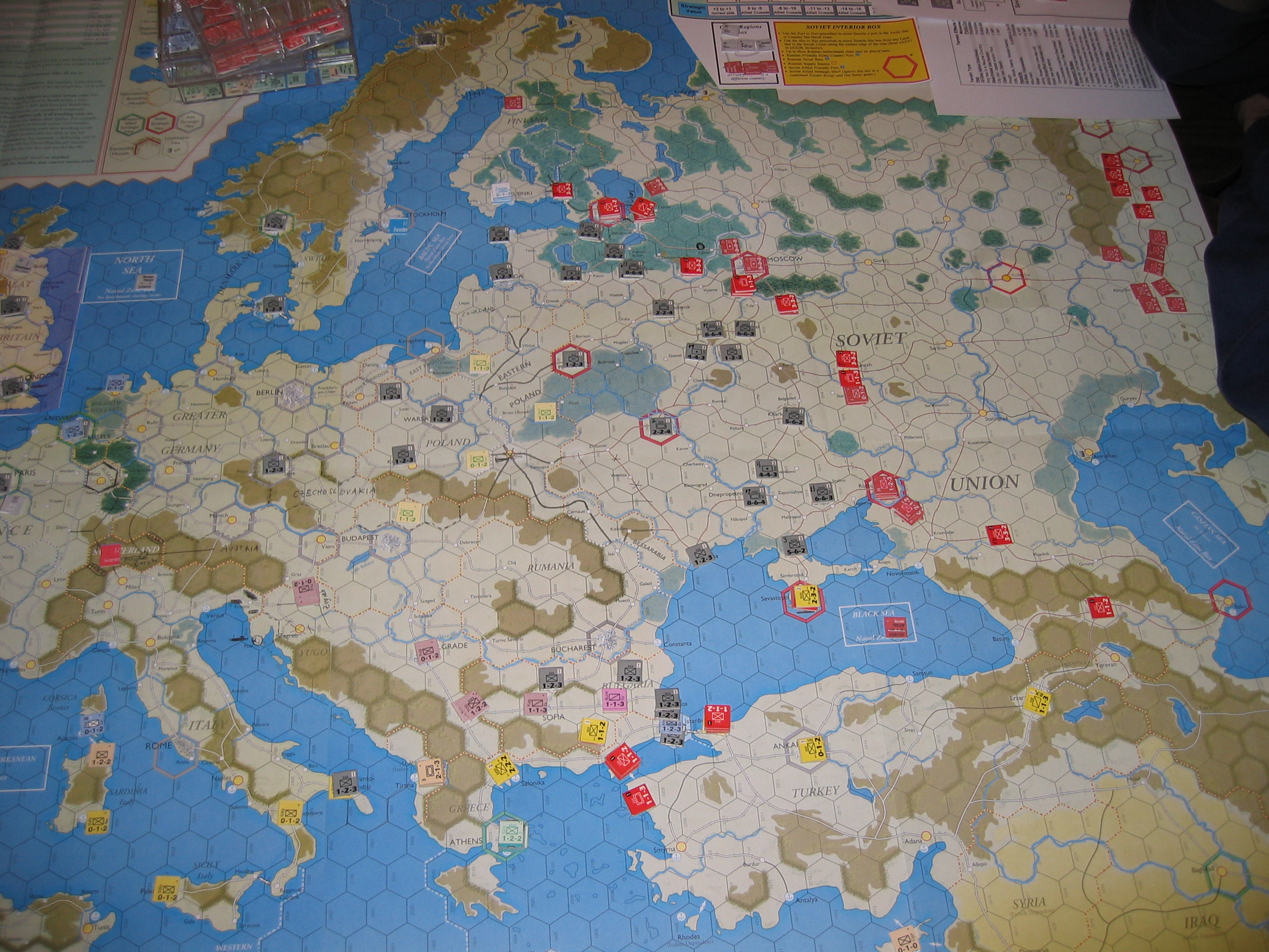Step counts: The soviets have 74 mobile infantry steps (plus 4 fixed forts and no armor; they'd probably have armor left if they'd remembered to have some in their force pool for Counteroffensive). The turks have 12 steps, including one armor (two infantry steps are OOS in Salonika). The brits have 2 armor and 10 infantry. I count 75 german infantry and 9 armor. Axis minors sum to 2 armor and 54 infantry, by my count. Of course, total Axis steps actually in the USSR are a measly 8&42 (most of my minor steps are tied up in the italians, yugoslavians, and Spanish, very few of which can get to the USSR and those keep on being pressed into service in the Balkans). I'm doing a terrible job of keeping with my rule of thumb: it's all about the Russians.