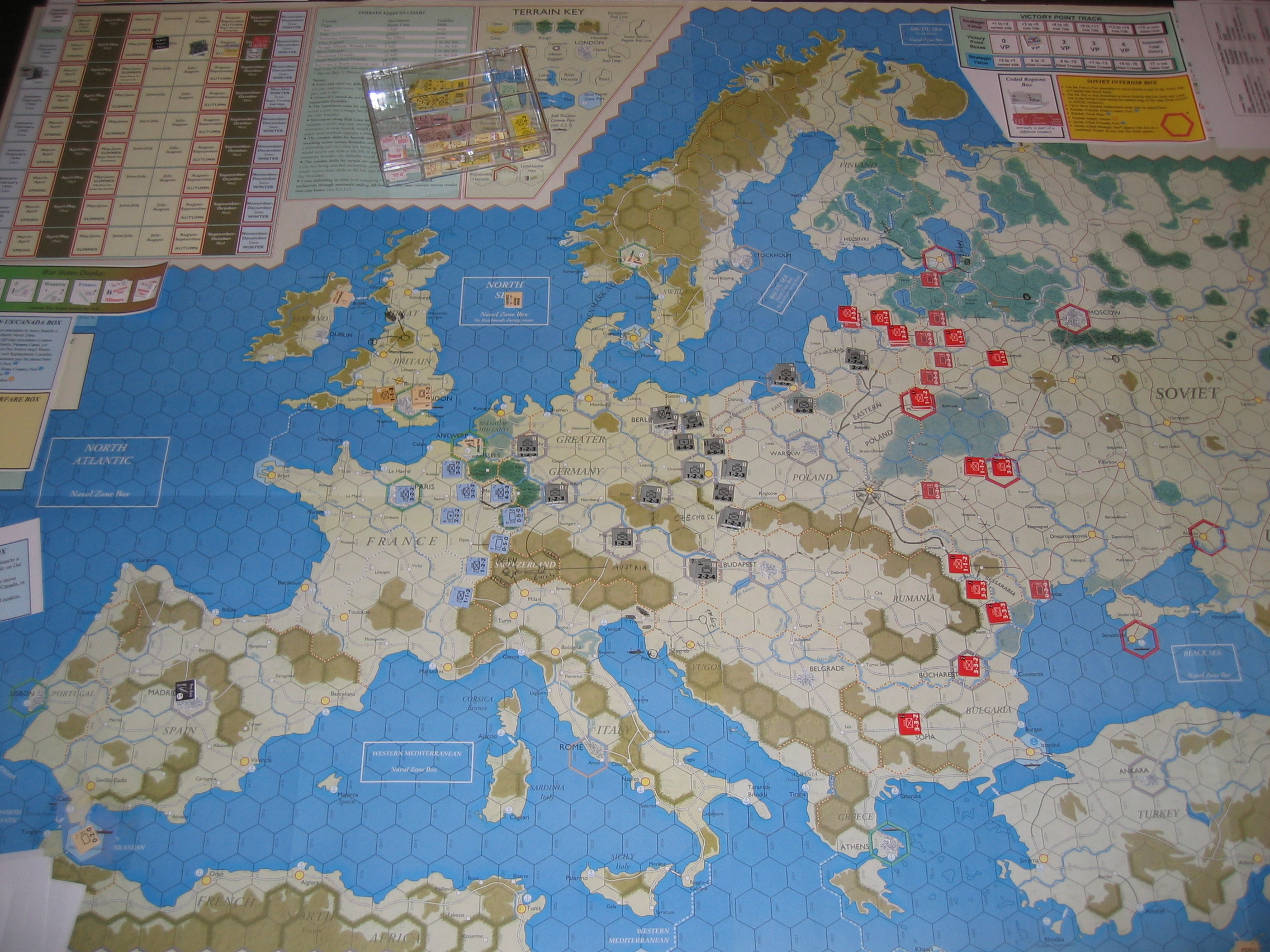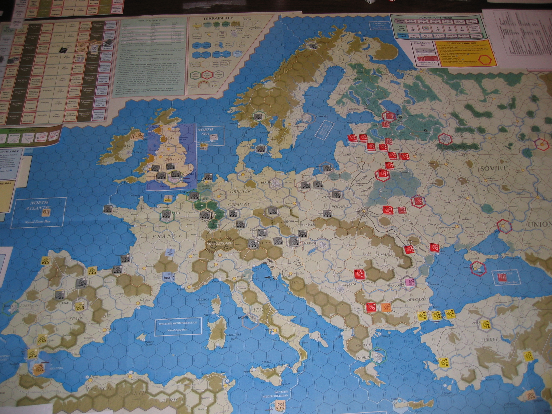 '41: The Soviets comintern in Spring, but get just a single Pressures Neutrals result and nothing else. [We missed the fact that Comintern is tossed if you go with the Political Purges.] Germany goes with LWP and then Yellow. The second summer turn sees both Paris and London fall. This result was largely because WAllied delay rolls were absolute crap in this time frame and the Luftwaffe rolled one or two 1's. We screwed up when LimWar cards are added to hands, and thus the Brits didn't mobilize until Spring... but the RAF rolled a 6, which means it wouldn't have shown up until the third turn of summer even with a winter play, which was too late. If there'd been one more WAllied support unit available, I might not have invaded out of fear that my plan for Paris would fail and I'd need an air shift to get it in the third turn.... Another factor contributing to London's fall was that on the first turn of summer, the French Navy sailed into the North Sea because Alex misunderstood the rules and thought that doing so would prevent an Axis beachhead in the North Sea.... So, I got hugely lucky here, and picked up that Albatross known as "garrisoning Britain." I did get to kill a fairly large number (6?) of British steps in the process of taking southern Britain, at least.