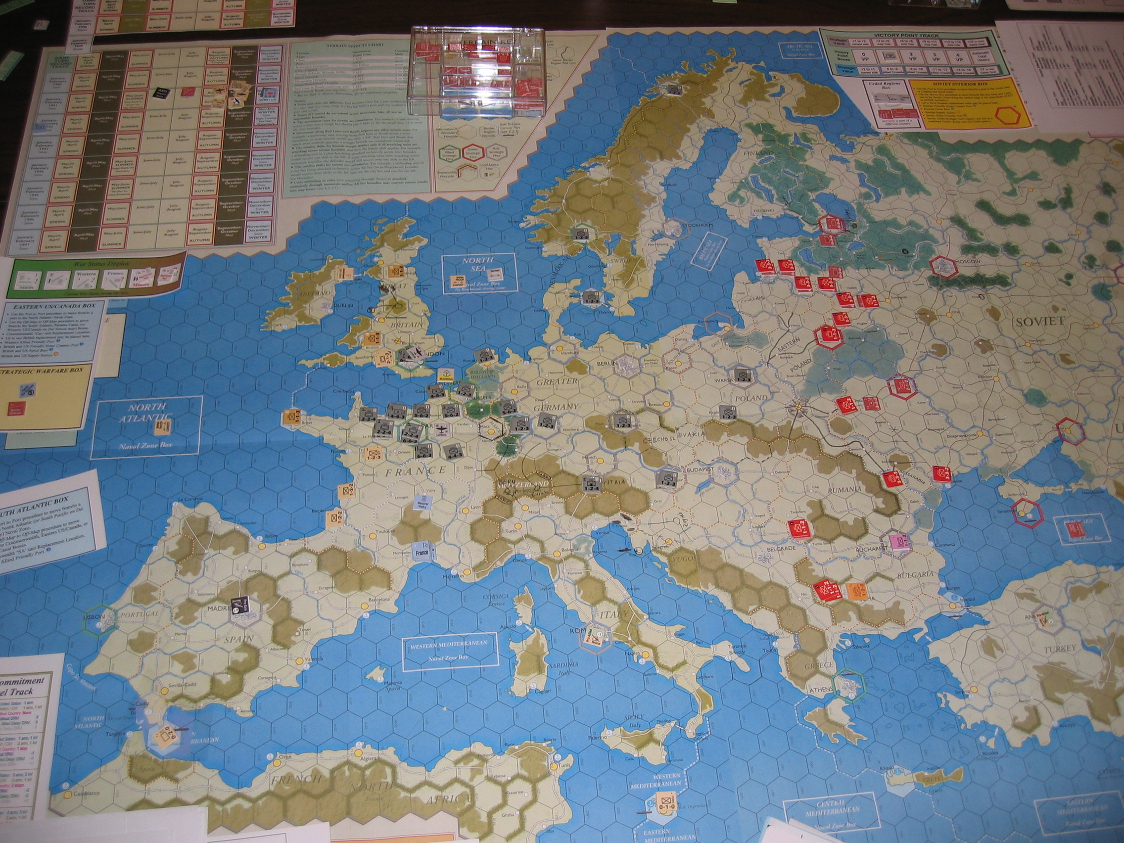'39: Czechoslovakia is conquered in Spring, just before the West Guarantees. Axis plays the N/S Pact for the summer; West uses that summer for Scandinavian League. The soviets Demand Rumania and Finland. The Germans Mobilize over the winter, getting 1 conditional step per turn.