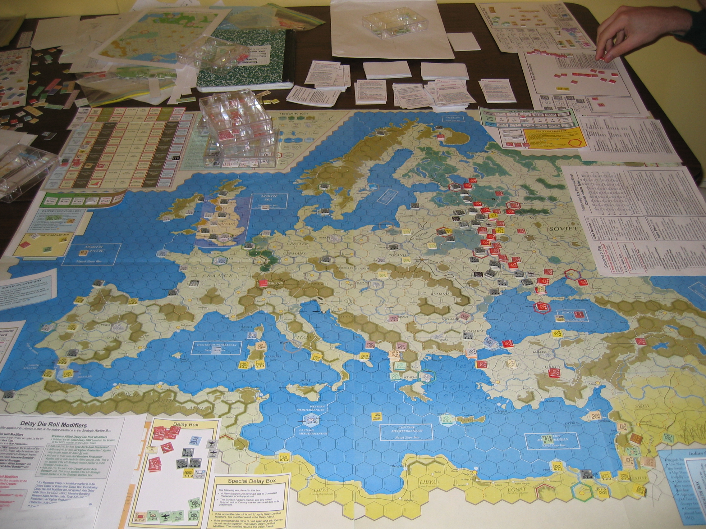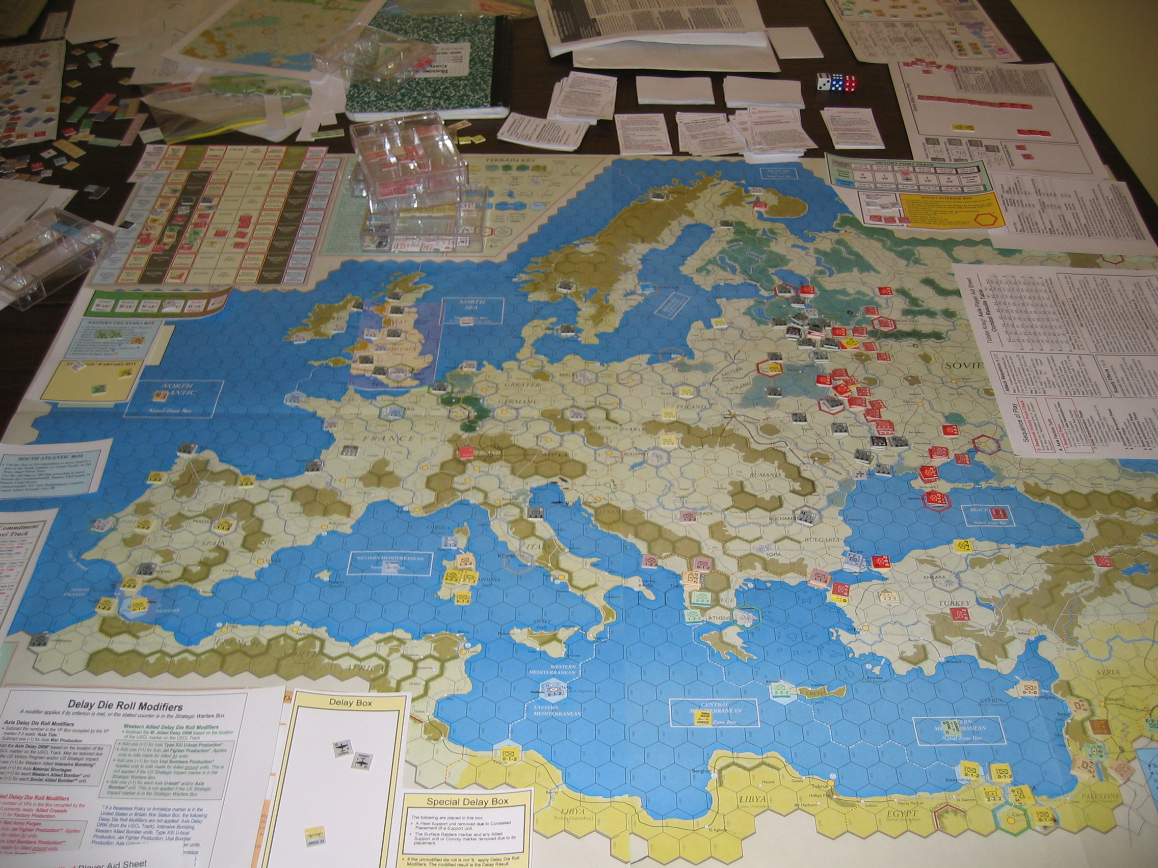 I reveal Jet Fighters, bemoan my fate, roll a Hitler Supports Nationalists for the political event, and started plotting my turn. But we realized that we'd been playing for 8 hours and it was 2300h and decided to call it a night.
