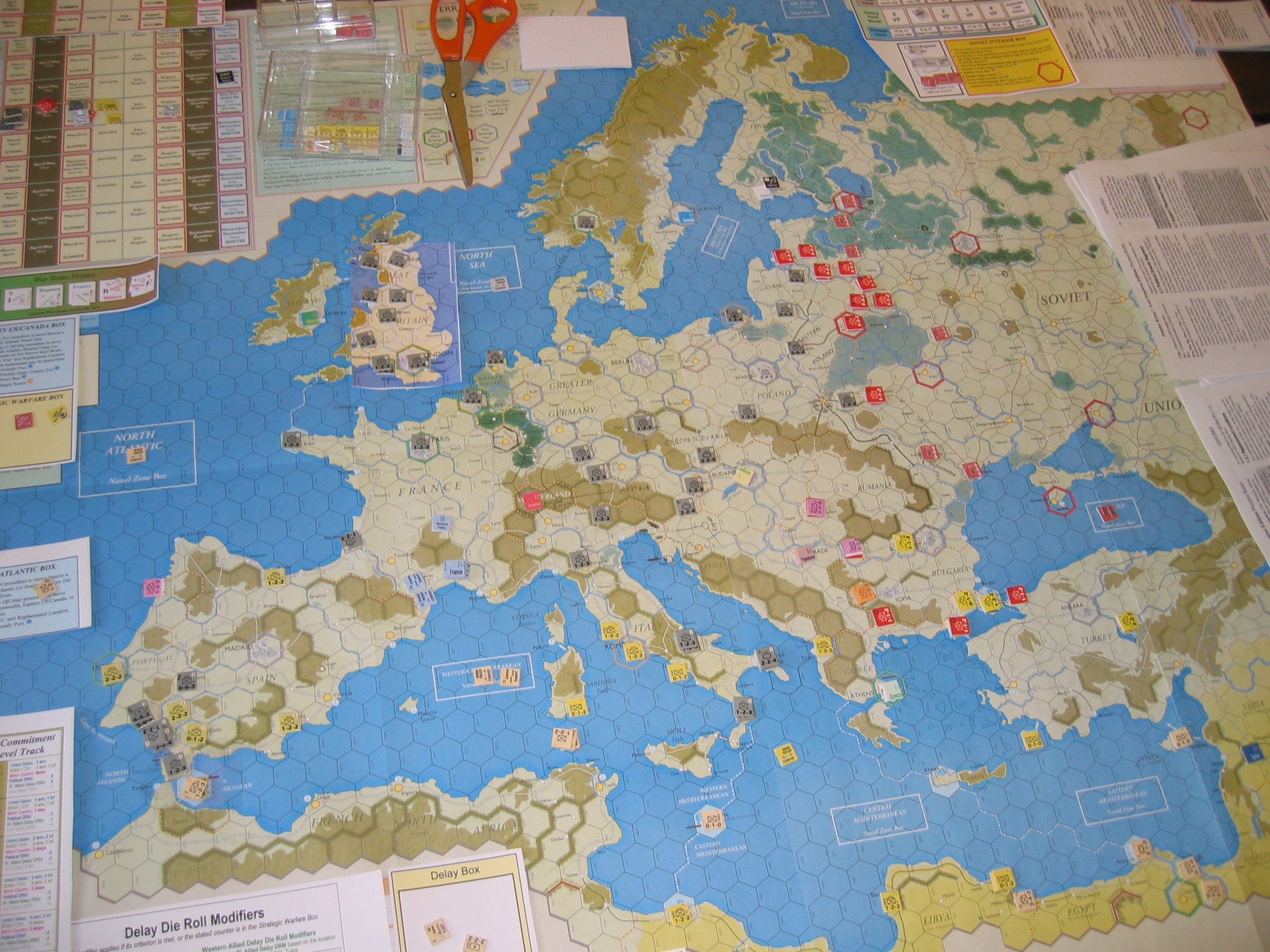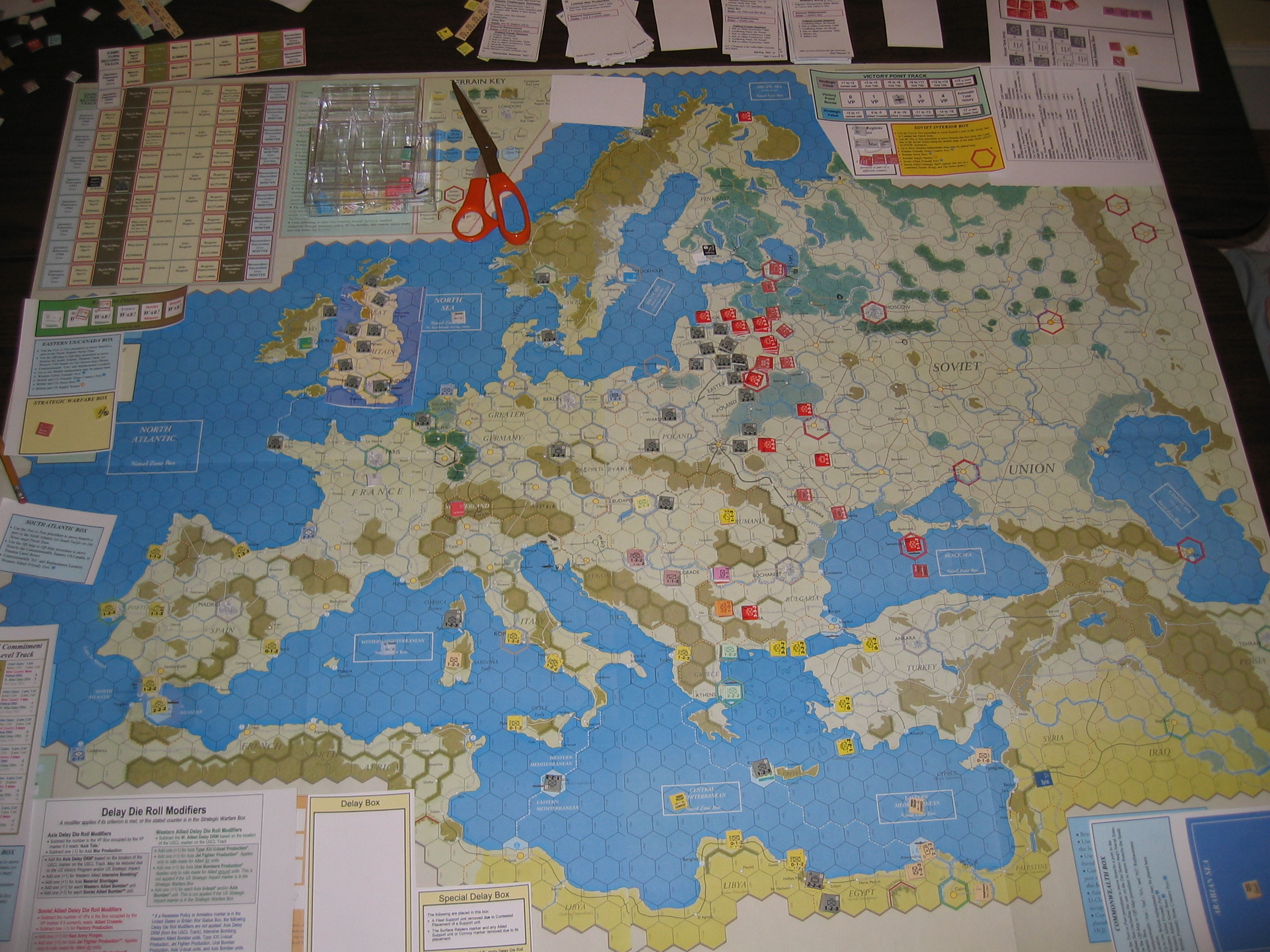 We basically got from the fall of France in summer '41 through the outbreak of Total War in Spring '43. Given that the Soviets had played Stalin Line and that by the fall of France the Soviets had burned all their useful "scare the Germans into coming after me" cards, I really had no reason to go after the Soviets in '42. In general, I think that spending forever in Pre-War as the Axis was a mistake; it gave the Soviets a free hand in their corner of the world; they got turkey as an ally and took out Bulgaria and Rumania (and would have gotten Hungary as well if they'd been cleverer about deployments).