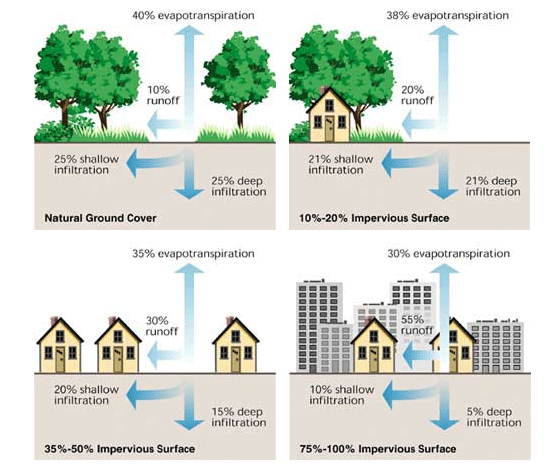 such as cities and downtown areas, can have over 90% impervious surface cover.