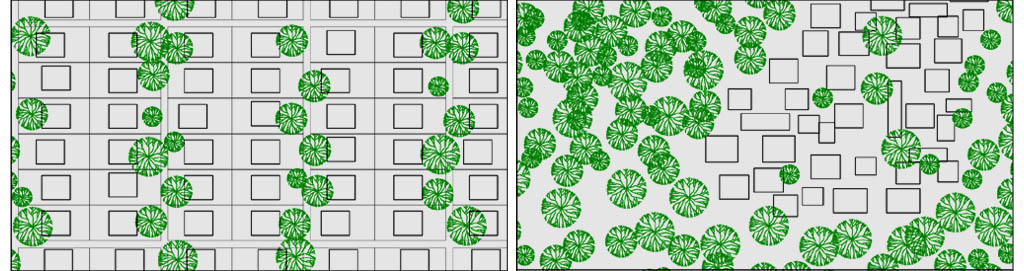 trees in large numbers interspersed throughout the city, each