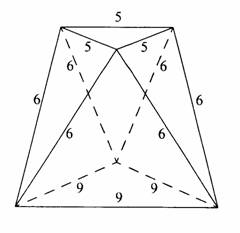 The given octahedron ABCDEF contains two equilateral triangles: equilateral ΔABC with sides measuring 5 units and equilateral ΔDEF with sides measuring 9 units.  Lateral edges AE, AF, BD, BF, CD, and CE are congruent and have a measure of 6 units.