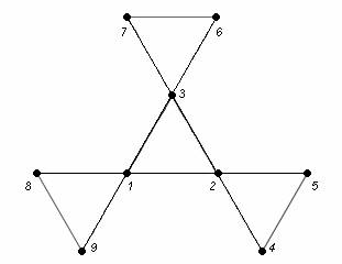 Let us label the vertices on the graph as shown, and let {n1, n2, n3, n4, n5, n6, n7, n8, n9} be the number of pebbles on each vertex {1, 2, 3, 4, 5, 6, 7, 8, 9}.