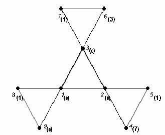 In the figure below is the combinatorial graph with 13 pebbles placed upon it.  It is not possible to place a pebble on vertex 9 through pebbling steps.    (The vertices are labeled in italics, and the initial number of pebbles on each vertex is given in bold.)