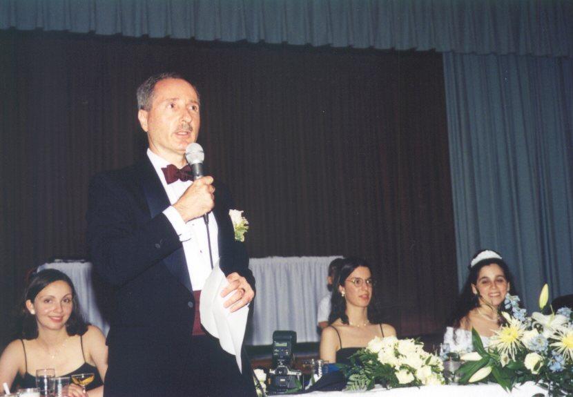 Aaron's father, who used to be a chemist, giving a chemistry-based toast (Aaron Ucko = AU = gold; Zhenya Nusinovich = ZN = zinc; now you make an alloy and go from there...) (31/72)