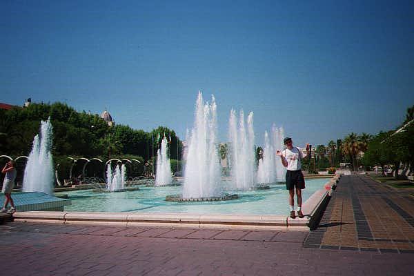 By a fountain in the same garden. Aaron is imitating the pose of the kitten on his shirt. (62/72)
