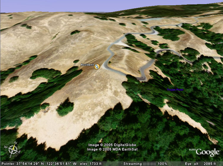 perspective view, again from GoogleEarth. Note how there is no shoulder on this road,