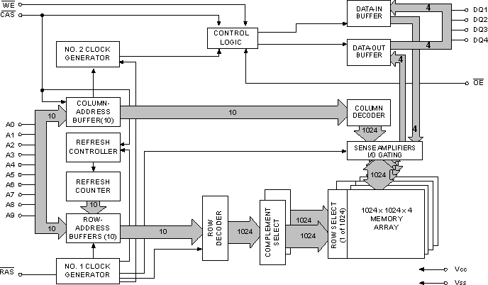 Well, with a few million of these sensitive devices on a single die, one can imagine that support circuitry is required. Here is a block diagram of a typical, bare-bones DRAM array (1Megx4 FPM):