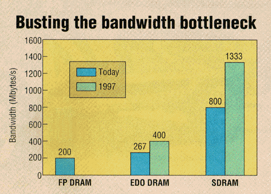 As a note from someone watching on the sidelines, the recent crash in DRAM prices indicates just how much DRAM manufacturers were inflating their prices. Even though DRAM prices dropped from upwards of $30 a Meg to around $5 a Meg, DRAM manufacturers are still making a small profit! A number of market factors were driving toward this crash; some of it is because the introduction of EDO and SDRAM forced FPM prices down to remain competitive, and some if it is because of the burgeoning demand for DRAM as new OSes and applications become less efficient and start chomping up more memory. Some of it is because of better process technology developed because DRAMs are getting denser. The DRAM market tends to be very elastic and prices volatile. Although EDO is the hottest stuff out right now, keep an eye on SDRAM. Make sure your motherboards support it as an upgrade, because it will probably be the Next Big Thing.