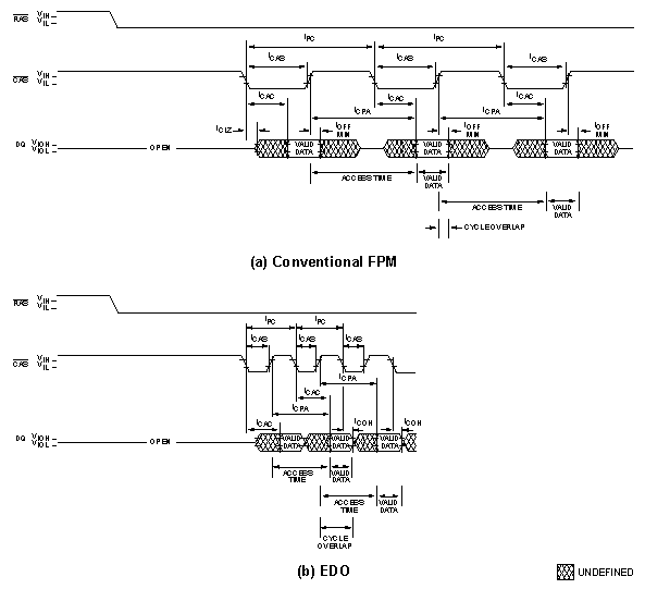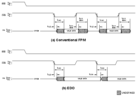 As one can see, in EDO, the time period for which data is valid is longer than the time period for FPM, hence extended data out. The technical difference is that the data buffers aren't turned off with CAS; instead, data remains valid until the next piece of data is available. Thus, this clever hack only requires modifications to the data buffer circuitry and a few other control functions.