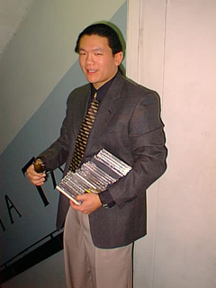 On Feb. 27th, 1999, ZBT had yet another successful theme party. The theme this time: Pimpz, Playaz, and Hustlaz. I thought it was a fun, very late 90's theme, and a good excuse to get way over dressed. =) I've been DJing parties more often lately, and this one was no exception. Most of the photos you see here are related to my DJ experience at the party. Aside from having tons of dressed up, decked out dancing party people, I had my own dose of excitement from the old, failing Carver amplifier we have powering the Bose 901's. In a pre-party sound check playing a remix of Sneaker Pimps Spin Spin Sugar (from Becoming RemiXed, track 4) that is really bass heavy, the amplifier overheated (even despite the beefed up cooling I had just installed) and also blew its fuse. Tom Cleary and I had to crack it open, cool off the thermal fuse, and replace the main fuse (the trick was finding an MDC-12 fuse at 10PM on a saturday! that's a whole other story, anyways). The main fuse blew out so hard that its contents had melted out, making it quite a trick to extract. After fixing that, we put the unit back together, and we were rolling just as the guests started coming in. Unfortuneately, the Carver amp failed again during the party (!), but luckily, our homebuilt powered subwoofer (built by Shamik Das and Allan Lum, based on the Bose wave cannon design--they took the class at MIT taught by Bose, so they know the physics of the speaker) made enough noise to keep everyone hopping on the dance floor. In the meantime, I was scrambling around the DJ stand with a bottle of quick-freeze spray in hand, trying to reset the thermal fuse. Luckily, we were back on-line in about one minute, and only a couple guests even noticed. From that point on, I cut all the bass going to the Carver and just pumped a lot of treble to give the illusion of loudness (psychoacoustics at work!), and tried to put as much bass as we could into the wave cannon. It worked, and after setting up some make-shift backup speakers, the party went smoothly from then on. So much for the saga of the DJ. Anyways, here are some pictures from the party.