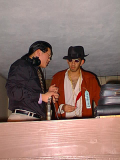 Up in the DJ stand, at the mixer with my headphones. You can almost make out my ponytail (at the time of writing, I think this is the only pic I have on the site with my newly-grown ponytail even close to showing). The pimp on the right is Chak Penta, another DJ at the party and quite the pimp.