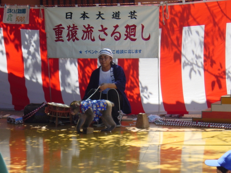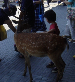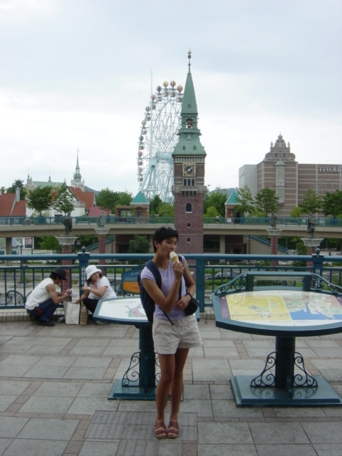 Michelle poses in front of an amusement park next to Kurashiki station. |