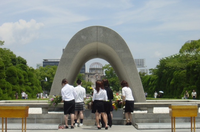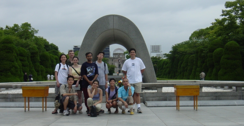 The group poses at the view of the Cenotaph and A-Bomb Dome, at the Hiroshima Peace Memorial Park. |