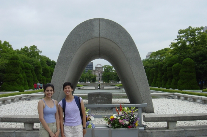 Saeeda and Michelle pose in front of the Cenotaph and A-Bomb Dome in Hiroshima Peace Memorial Park. |
