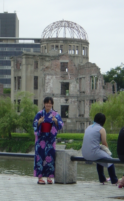 A young Japanese girl in Kimono poses in front of the A-Bomb Dome. |
