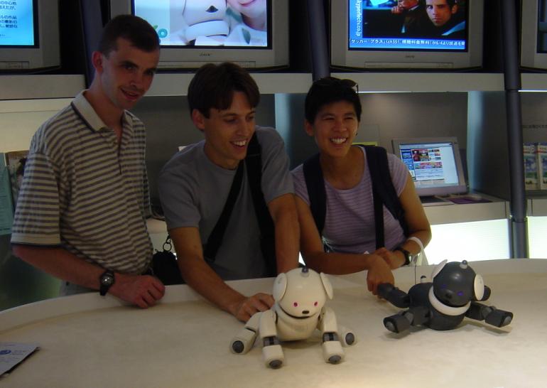 Andre, Patrick, Michelle pose with Aibo (Sony's robo-dog).  |