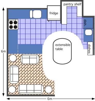 This is doable even if there isn't much space available in general. For example, here's a sketch of an open-plan great-room that fits living-room/dining-room/kitchen functions into a single 6-meter-square space.