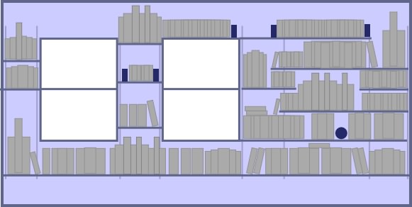 - Set up clusters of shelving all over the room(s) rather than a few monolithic blocks or walls of shelves.