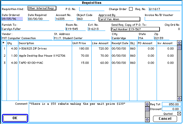 Ahhhh, the good ol' days! I discovered on this first Macintosh project that a microcomputer developer must wear all hats. We are System's Programmer, DBA and application programmer! I spent a year researching all the ways a local database could be corrupted and all the ways my clients could avoid that corruption. Although, I spent a few sleepless nights that year, the outcome was successful. MITCAM has been in use now throughout MIT for over 6 years. No one, to my knowledge, has lost any data. Staff enter non-personnel (purchase orders, travel expense forms, petty cash, etc) & personnel commitments (new hires, salary information, labor distribution, vacations, etc) and manage their accounts through custom reports designed and programmed by John Miller ( johnm@mitvmc.mit.edu).