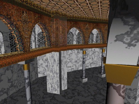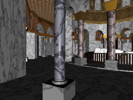 We also had to make approximations in applying textures to the model. We did have an abundance of scannable images, but there were some surfaces for which we did not have a picture, or for which the pictures that we did have were unusable. In these cases, we either repeated a similar pattern that we did have a photo of, or we used procedural texturing. For example, there are many surfaces (such as the interior of the outer walls, and the lower portions of the piers) which have marble inlays, or pieces of quartered marble. Since we didn't have photos that were sufficient for image mapping, we procedurally textured these surfaces with a grey marble texture. Other areas where we made approximations: