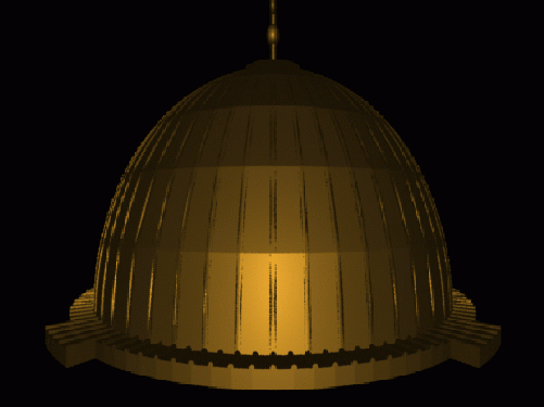 The dome was written in OpenInventor using QuadMeshes for the ribs and IndexedFaceSets for the rest. The actual dome consisted of many rectangles of burnished metal. Marleigh attempted to capture this by making the dome out of rectangles instead of the Sphere primative. She also modelled a finial at the top of the dome. This was a typical finial of a mosque, a spire a few meters tall topped by a cresent moon facing upward.