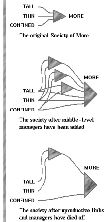 As future problems are encountered, middle-level agencies and the links between agencies are strengthened and weakened depending on what results they have on the overall result. The overall importance of managers are weakened if conflict or a lack of conflict under them has bad results or lead to wrong answers. If non-compromise or compromise under a manager continues to yield good results, the manager would become stronger. A similar strategy might apply to the links between agencies. With experience, inappropriate middle-level managers would die off while managers which organized appropriate lower-level agencies would become fully integrated into the society. Many of the original links between the lower-level agencies and the higher-level agency would also die off, as they introduce unnecessary conflict.