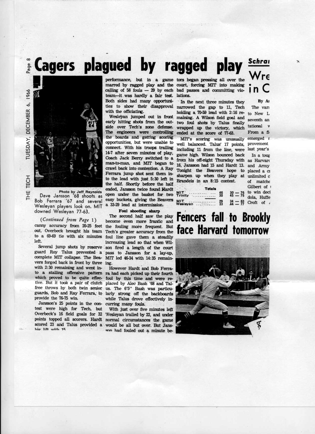 This page plus the following stat sheet were found in 2007 by our 1963-64 Freshman Coach, Arnie Singal. Arnie is still involved in coaching at the local level. He was also selected to be the US boy's high school basketball coach for the December 2007 Maccabiah Pan American Games in Buenos Aires. Bradley Gampel '09, who was my advisee as an MIT freshman, and is now a varsity point guard and co-captain, also played in an earlier edition of the Maccabiah Games.