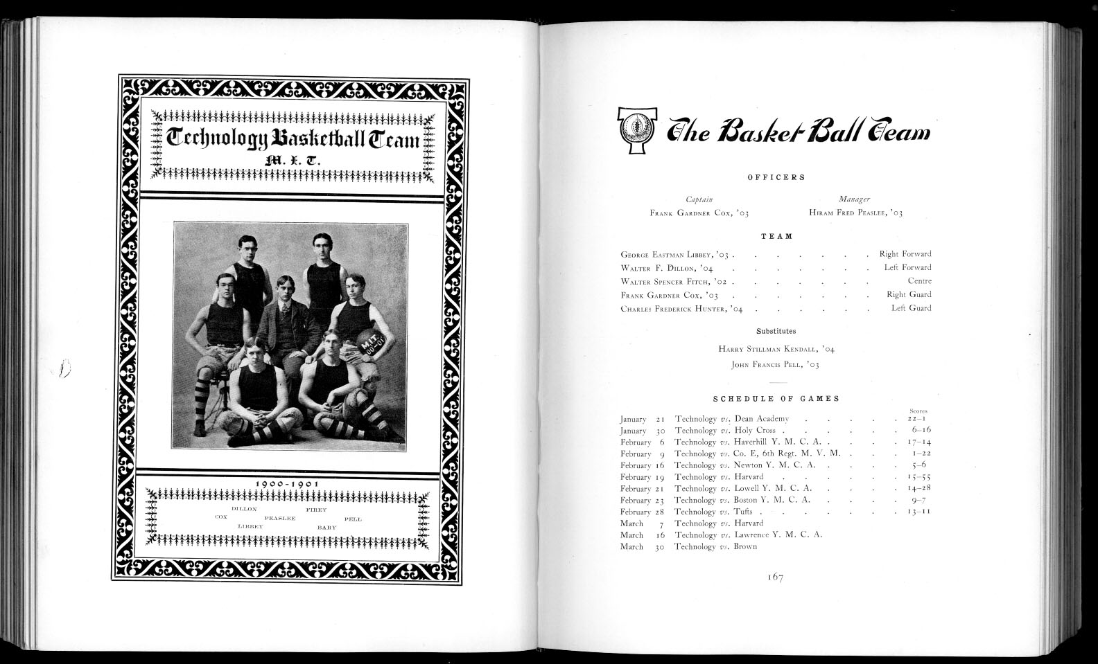 These are two pages from the 1902 Technique, the first appearance of any basketball record in MIT's annual student yearbook. Note that the sport is spelled "Basket Ball". Picture thanks to Technique manager David Templeton '08.