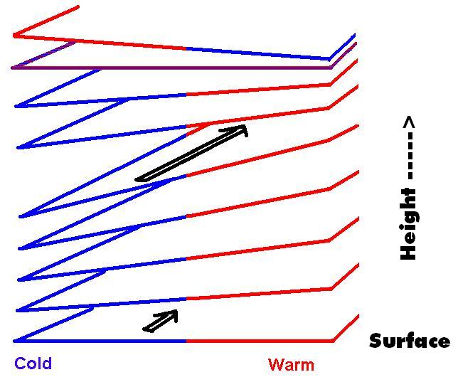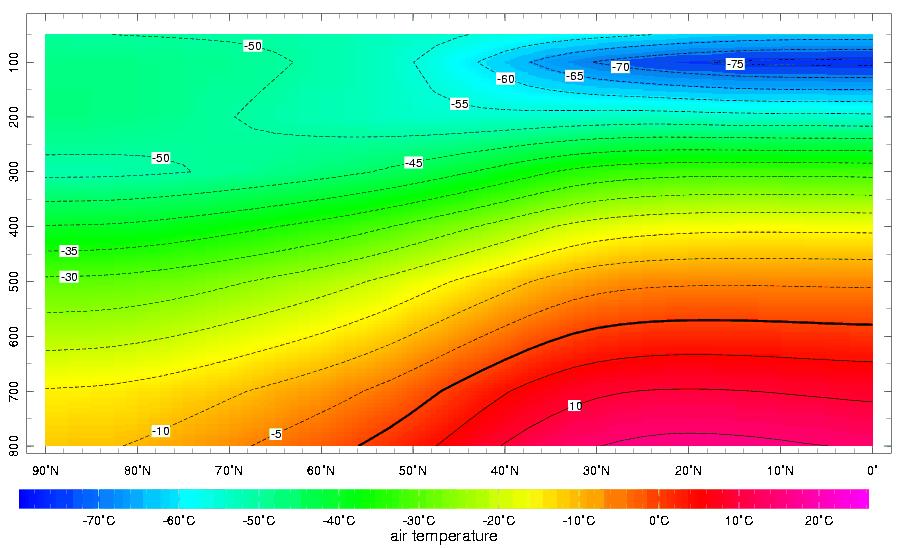 As we have seen in the previous section, there is a north-south temperature gradient. It is warm at the equator and cool at the pole (at the ground). This gradient is reversed at the very top.