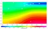 The following picture is a cross section of the atmosphere at the exact same time. It is a vertical section along the 180 degree longitude line from 30 north latitude to 60 north latitude (which appeared to be the strongest flow in the previous map). The scale on the y-axis is the pressure (which is proportional to vertical height). Plotted in color is the velocity of the jet. Plotted with lines is the temperature. Click to enlarge