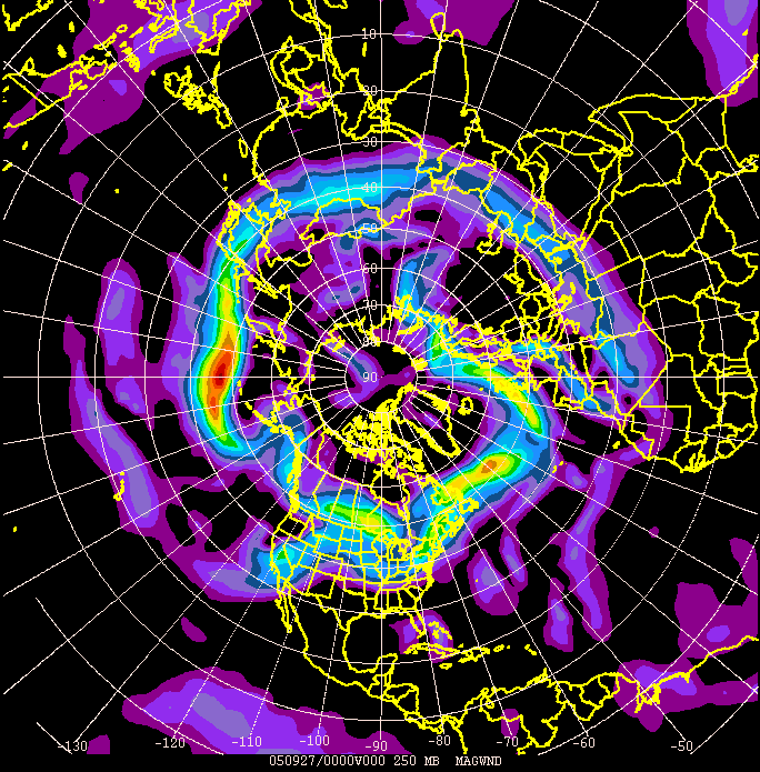 The following picture shows the intensity of the jetstream at the 250 mb surface as of the morning of September 27, 2005. Click to enlarge