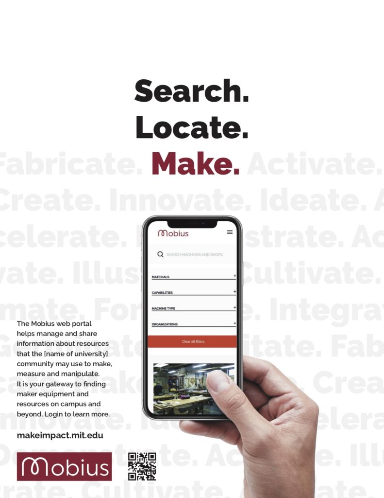 The Mobius web portal and platform allow students at universities that have joined the Make Impact Consortium to find maker resources, access training credentials, and connect with makerspaces. The promotion package below will give you a head start on getting the word out about Mobius. You can customize copy and templates for your school if needed.