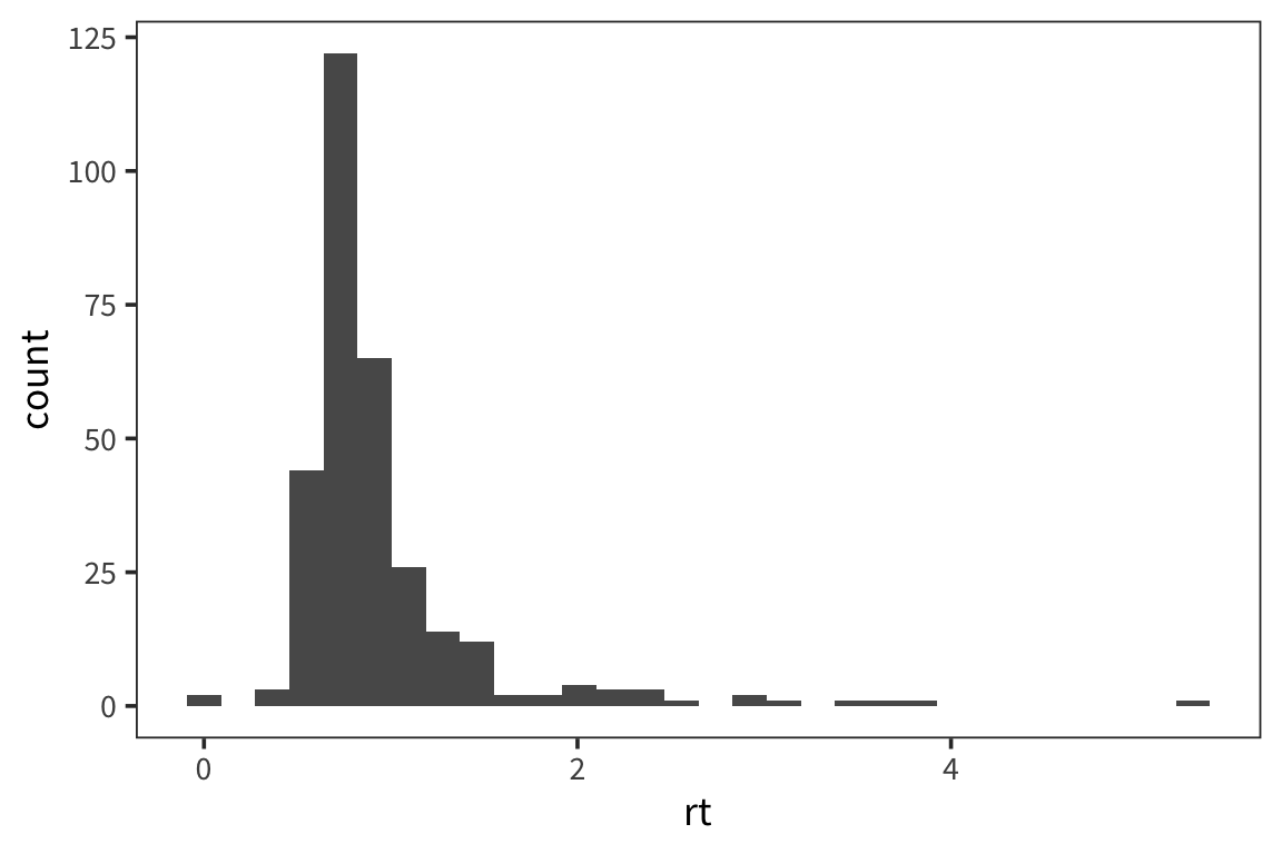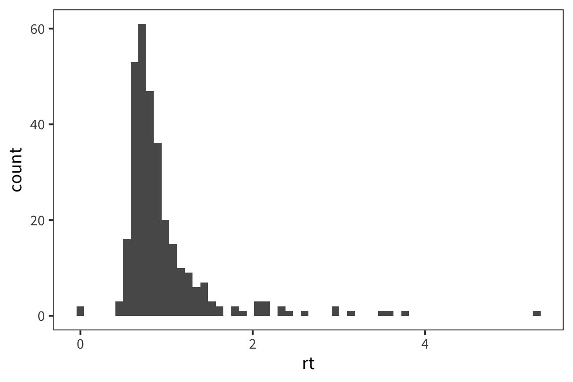 geom_histogram() is going to make this plot a histogram. A histogram has values of whatever variable you choose on the x axis and counts of those values on the y. The aesthetic mapping, aes(), arguments let us specify which variable, in this case rt, we want to know the distribution of. We can also change visual aspects of the geom, like the width of the bins, depending on what will make the graph more clear and informative.