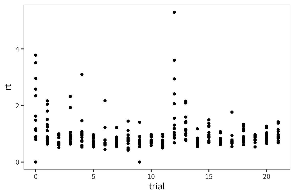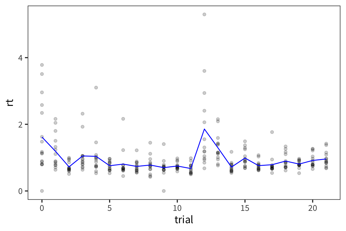 geom_point(data = rt_data, aes(x = trial, y = rt), alpha = 0.2) +