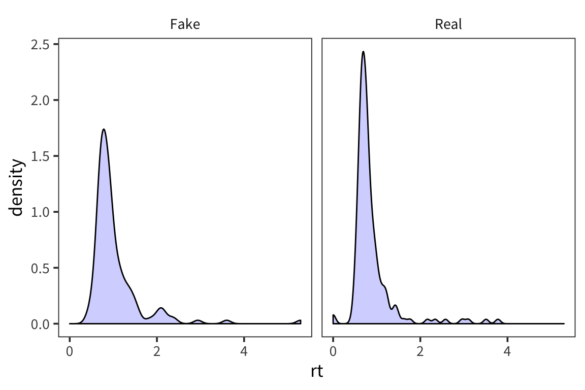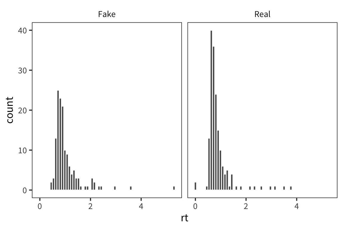 Now we want to start addressing our question about how RTs may differ for real vs. fake words. One way to do this is to split the RT data we have into Real and Fake and plot the data side by side. ggplot has an easy way to do that with facetting.