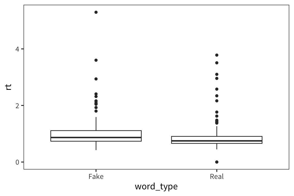 It looks like real words have faster median RTs and somewhat less variability (except for that 1 outlier).