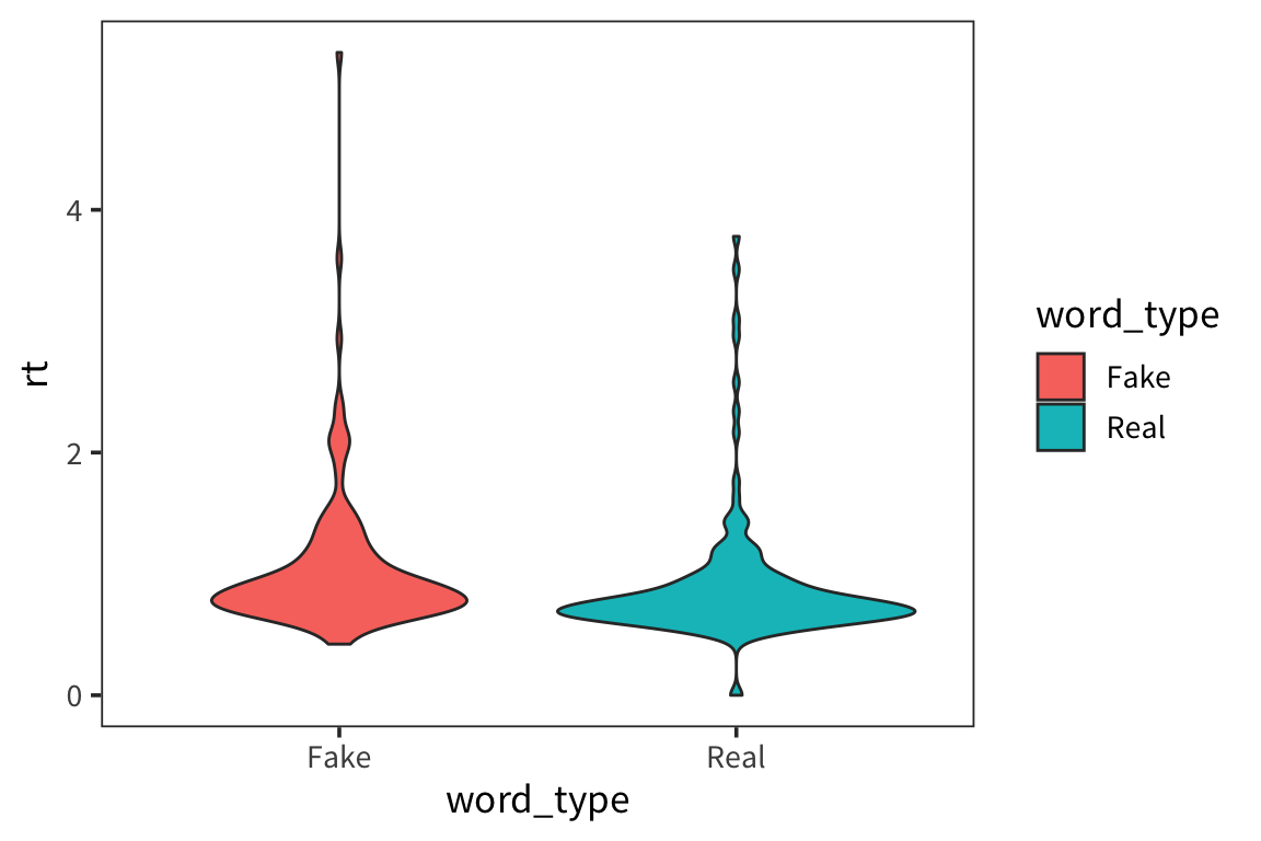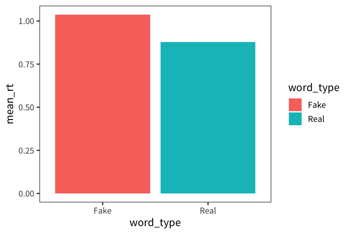What hypothesis do we want to test about the data? Maybe fake words take longer than real words to identify.
